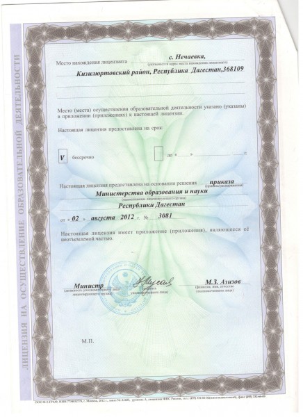 | Адрес местонахождения образовательной организации* | 368109, Республика Дагестан, Кизилюртовский район, селениеНечаевка,ул.Имама Шамиля 6 |